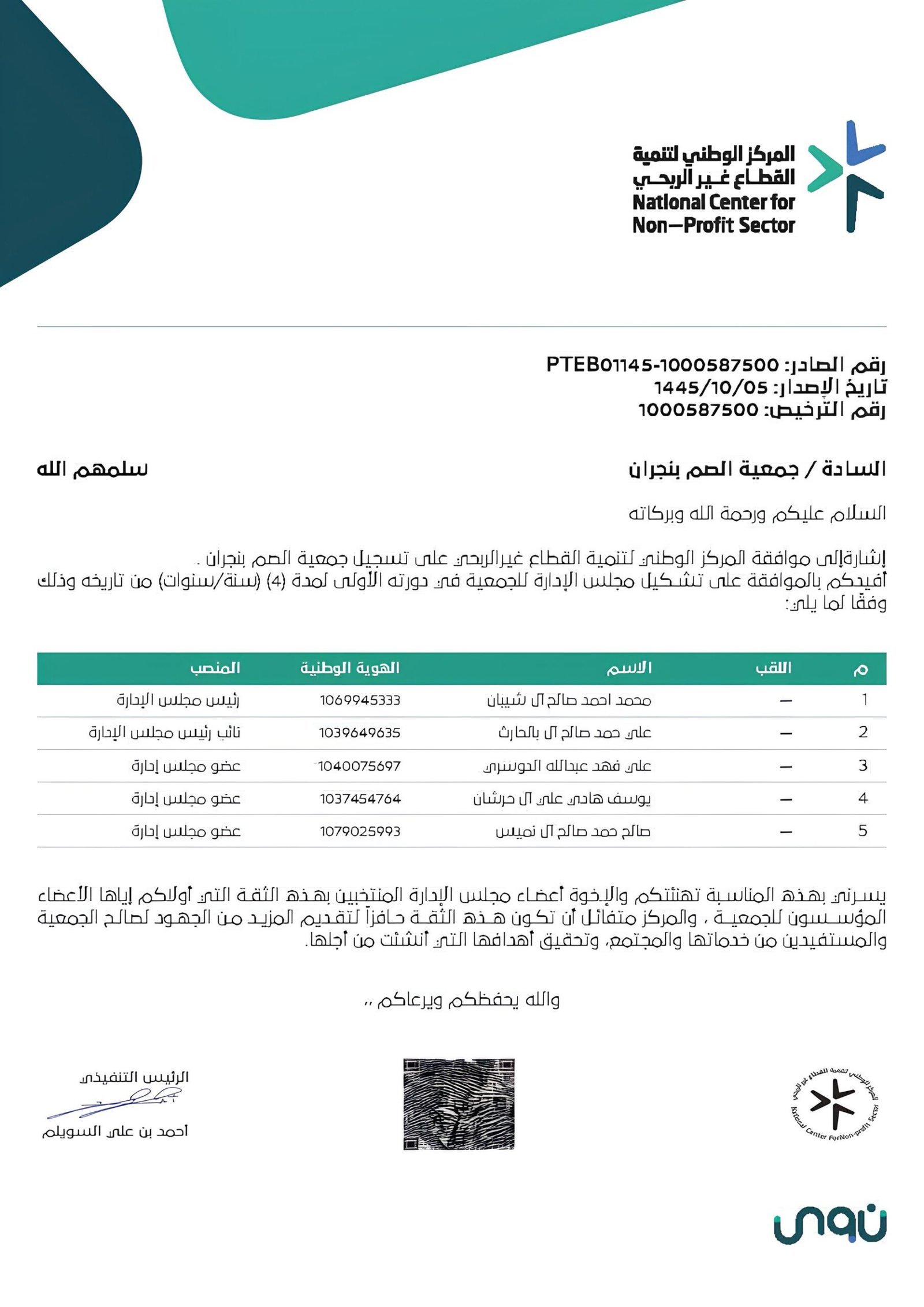 مسجلة بالمركز الوطني لتنمية القطاع غير الربحي برقم 1000587500 0530801919 Deafnajran2024@gmail.com